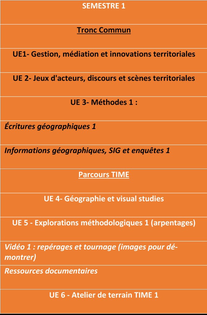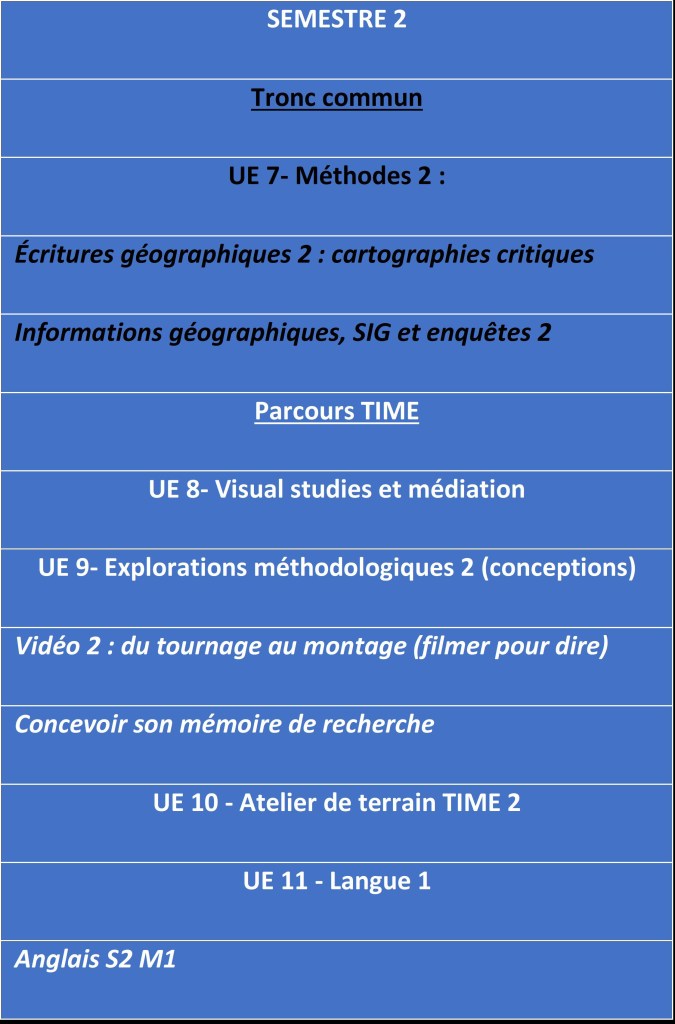 Géographie et visual studies : Parallèlement à la formation à la production d’images (film vidéo, série photographique, cartes, dessins, croquis, etc.) comme texte géographique, l’objectif de ce cours est de donner aux étudiant·es du parcours TIME un cadrage théorique robuste pour appréhender les images en tant que productions sociales, politiques et culturelles d’une part, en tant que produits de consommation d’autre part. Comment la visualité est-elle construite socialement, comment la société est-elle construite visuellement ?