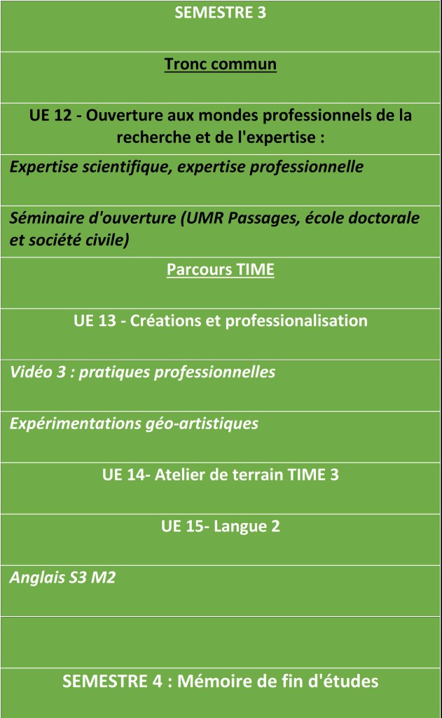 Séminaire d’ouverture (UMR Passages, école doctorale et société civile) : Le troisième semestre du parcours TIME comprend un séminaire d’ouverture à la recherche ou à la société civile, au choix de chaque étudiant·e en fonction de son projet professionnel. Ainsi, chaque étudiant·e construit ce cours à sa façon, en puisant dans plusieurs offres et en les combinant en privilégiant soit la découverte de différentes directions, soit l’approfondissement d’une seule. En ce qui concerne la recherche, il s’agit de suivre des séminaires de recherche de l’UMR Passages, centre de recherche CNRS/universités bordelaises/Ecole nationale d’architecture et de paysage de Bordeaux auquel le Master InTEx est adossé, et/ou des séminaires d’initiation à la recherche offerts par l’Ecole doctorale Montaigne-Humanités, école doctorale dans laquelle s’inscriront par la suite les étudiant·es du parcours qui souhaitent orienter leur carrière professionnelle vers le monde de la recherche et/ou de l’enseignement supérieur. En ce qui concerne la société civile, il s’agira pour les étudiant·es d’assister en observateurs à des opérations de médiation autour d’enjeux environnementaux.