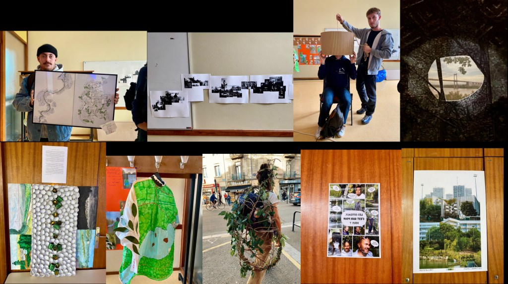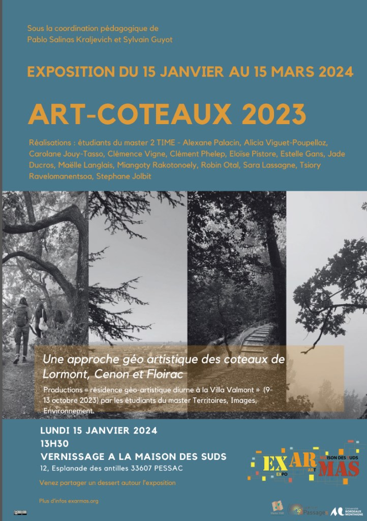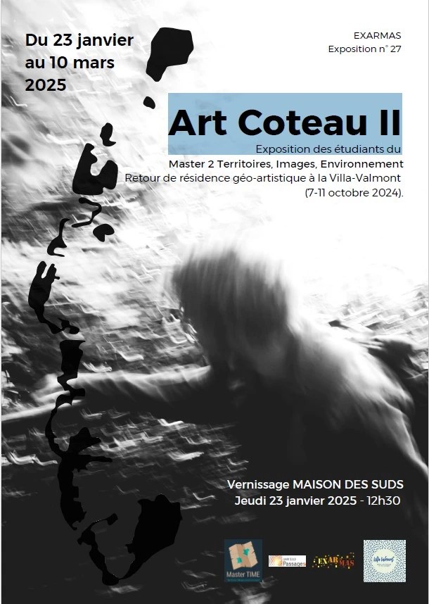Chaque automne (Premier semestre de l’année du Master 2), la promotion des étudiant-e-s de M2 TIME part une semaine en résidence géo-artistique pour travailler sur un territoire précis et sur une ou plusieurs thématiques en prise avec leur formation. Chaque sortie de résidence donne lieu à une présentation orale des oeuvres géo-artistiques réalisées (photos, capsules vidéos, dessin, collage, peinture, cartographie sensible, approches mixtes etc.) qui sera éventuellement suivie par une exposition.